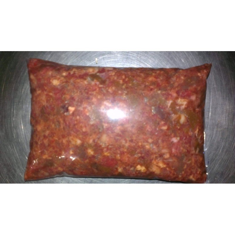 Whole beef chunks, muscle meat (75-80%), bone (10%) , lamb, pork or beef liver (5-10%), other offal (5%)