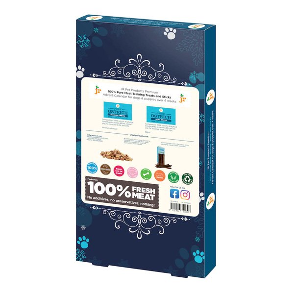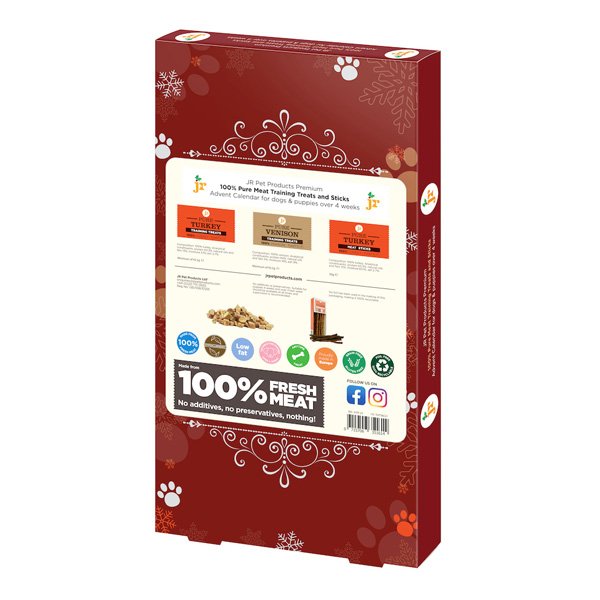 Introducing the NEW JR Advent Calendar which includes our Pure Venison and Turkey or Ostrich Meat Training Treats and a whole pack of Turkey or Ostrich sticks, all wrapped up in our 100% recyclable Christmas calendar outer.