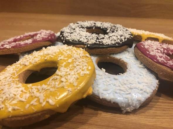 Homemade peanut butter is used to create the base of the doughnut, then top with a dog-friendly and sugar-free, tapioca-based icing, before sprinkling with further doggy delights.