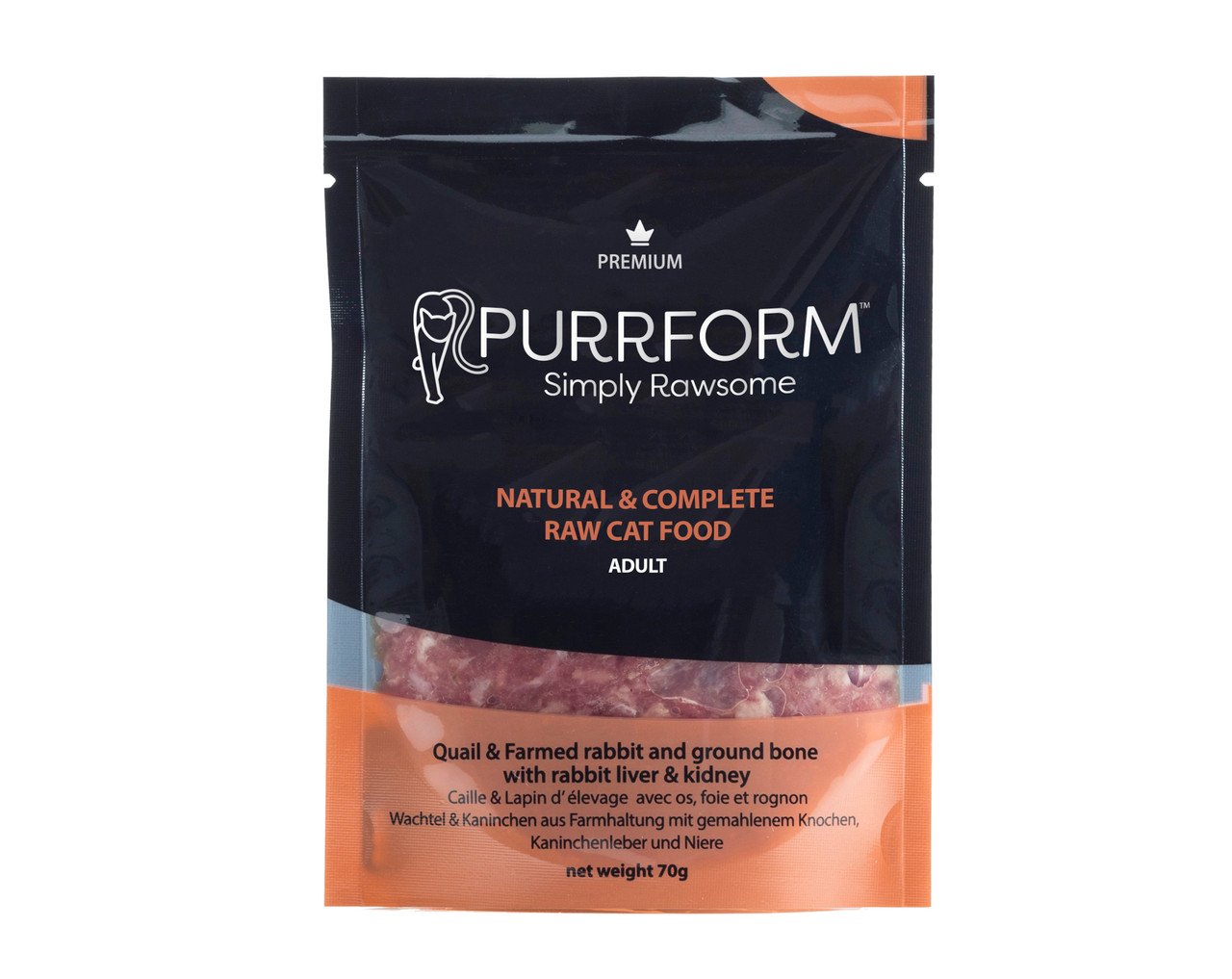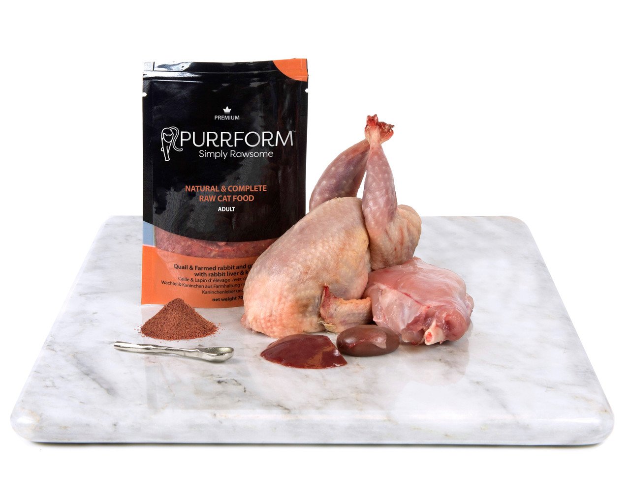 Purrform Quail & Farmed Rabbit meat and Ground Bone with Rabbit Liver & Kidney is a complete natural pet food for adult cats that contains nothing more than the ingredients listed.